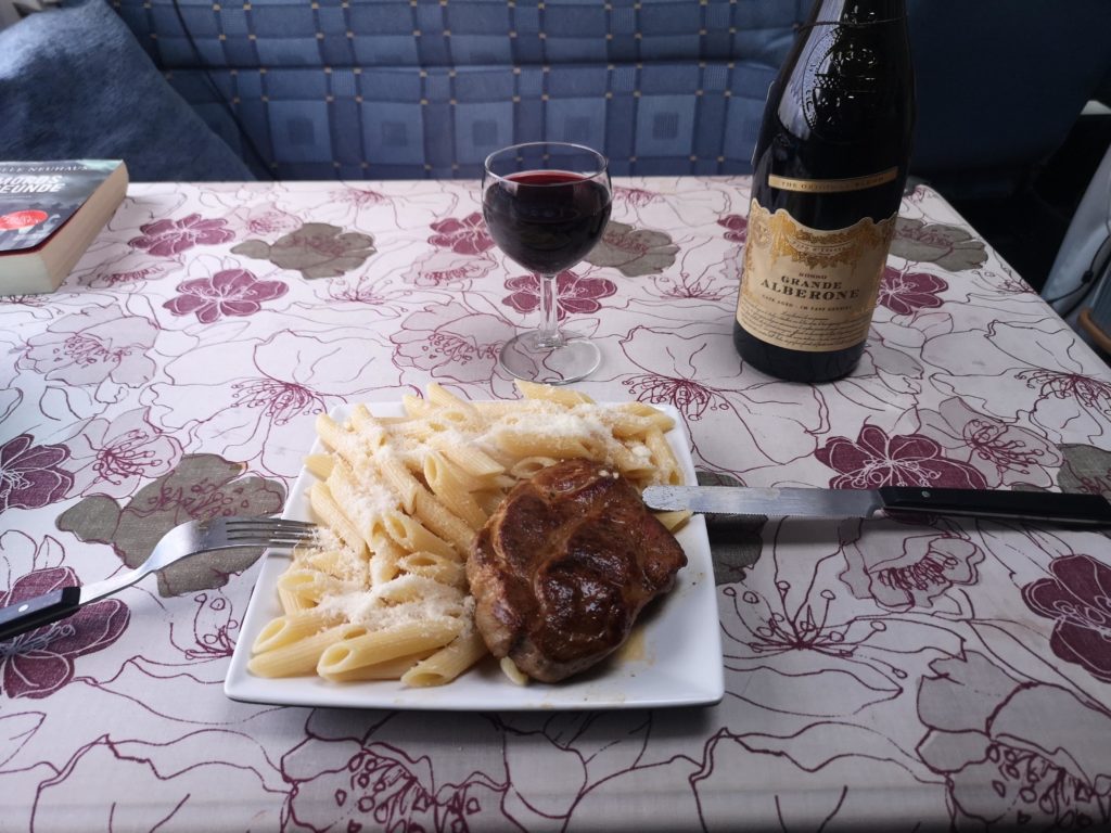 Für den Abend ist nicht’s geplant, alle sitzen zuhause in ihren WoMo’s. Ich koche mir ein einfaches Abendessen, dafür viel! Ein grosses Steack und viel Teigwaren, dazu reichlich Wein! Dann Fernsehen mit einschlafen wie zuhause, später dann Zähneputzen und weiter schlafen im Bett. Ich lebe ja eigentlich behaglich, wenn nur das Wetter nicht so garstig wäre!